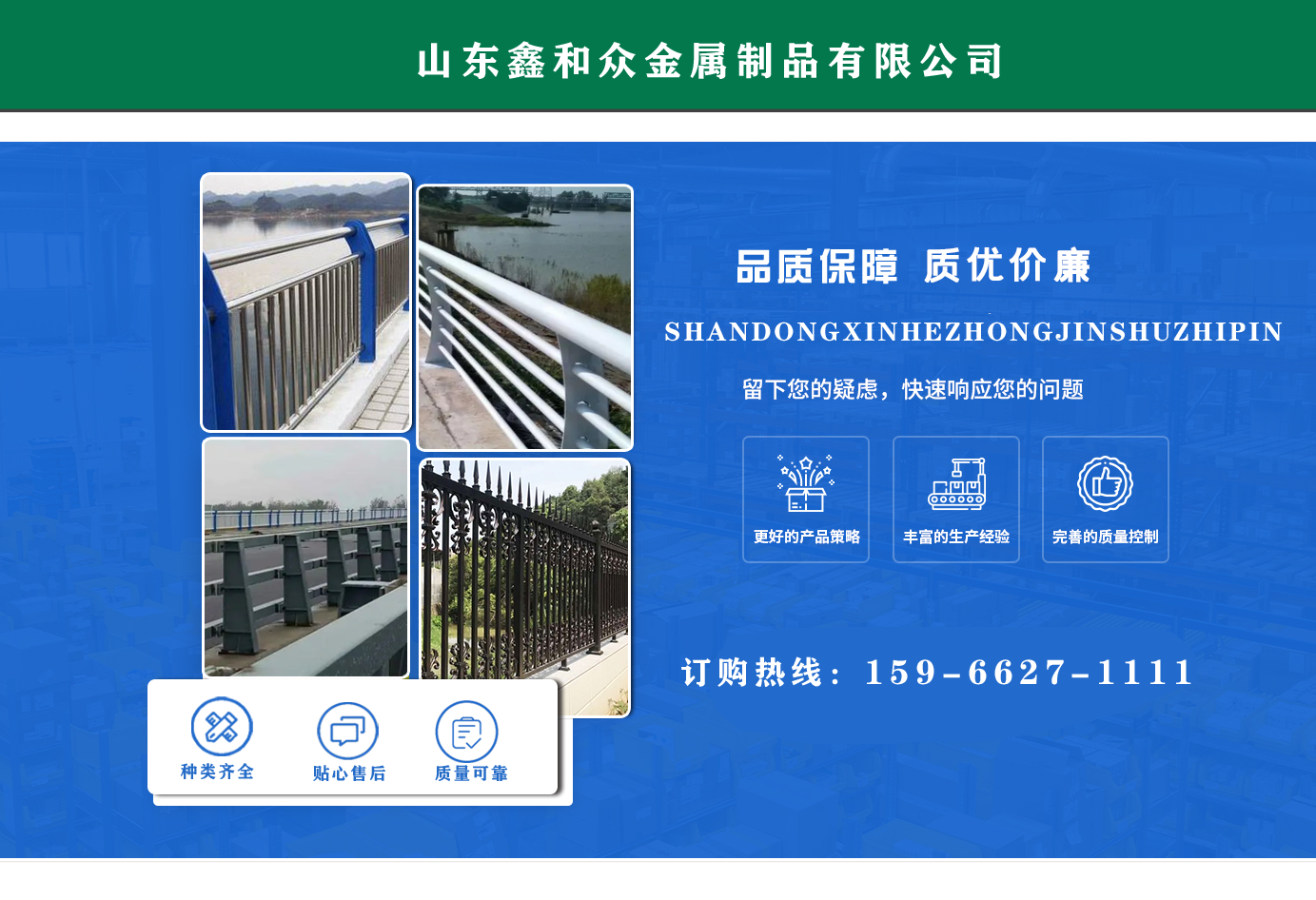 山東鑫和眾金屬制品有限公司主要產品有防撞護欄,橋梁護欄,道路護欄,河道護欄,不銹鋼護欄等護欄。提供設計方案,一站式定制,包您滿意價格優惠,歡迎來電咨詢!    公司常年從事銷售護欄防撞護欄,橋梁護欄,道路護欄,河道護欄,不銹鋼護欄,橋梁鋼護欄,河道燈光護欄等。產品廣泛應用于橋梁、河道、旅游景區、道路、公路、公園、小區、景觀、道路防撞等領域?!   」井a品均采用優質不銹鋼材料,符合相關標準。各種型號不銹鋼復合管及護欄,質量嚴格把控。產品強度高、耐腐蝕、焊接牢固、抗沖擊、性能好,防撞護欄結構簡單、美觀實用大方?!    g迎前來訂購!...